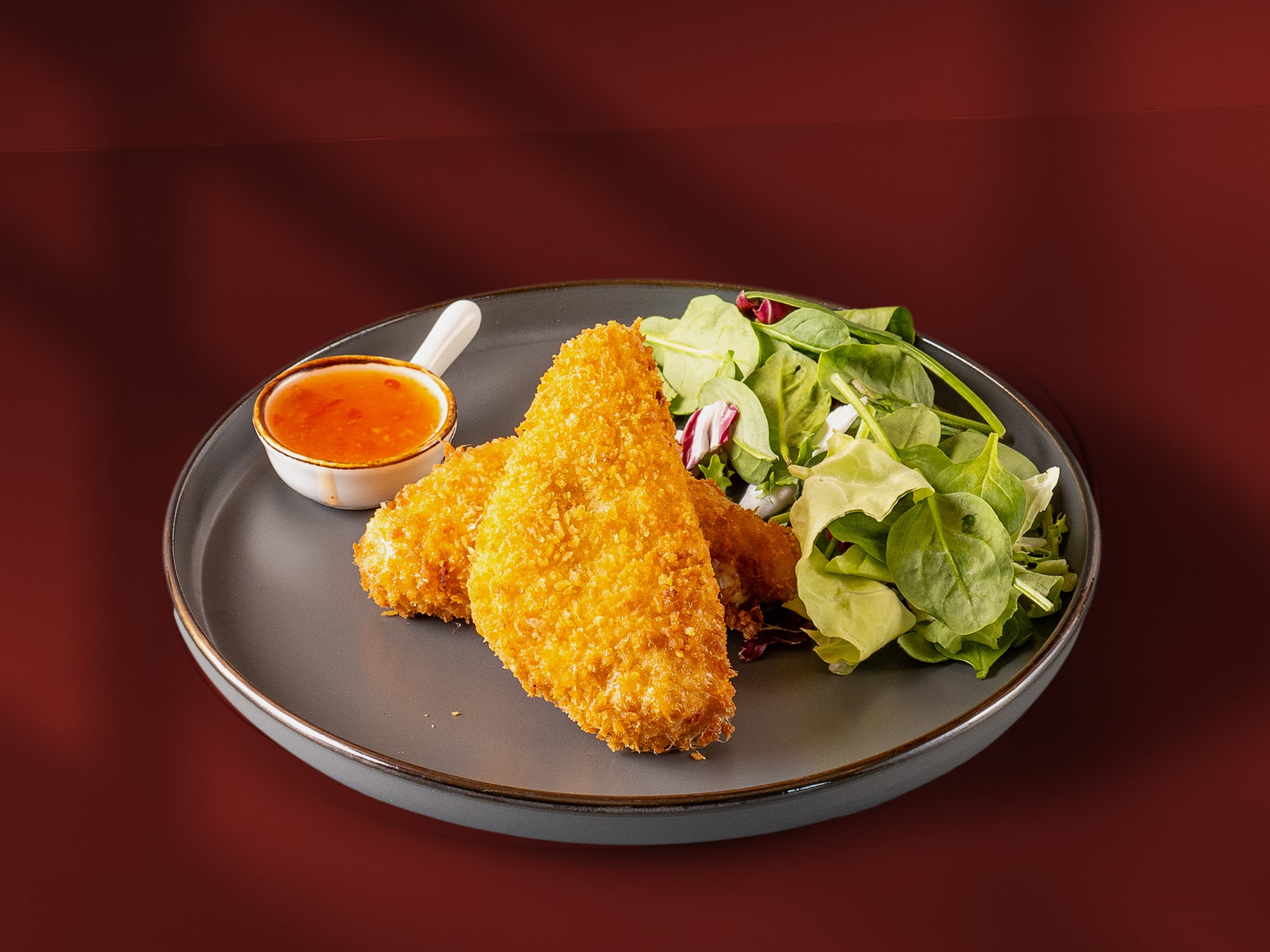 Sos sweet chili -50g (), Faina alba -40g (), Mixt salad -30g (Radicchio, Rucola Spar, Salata verde)