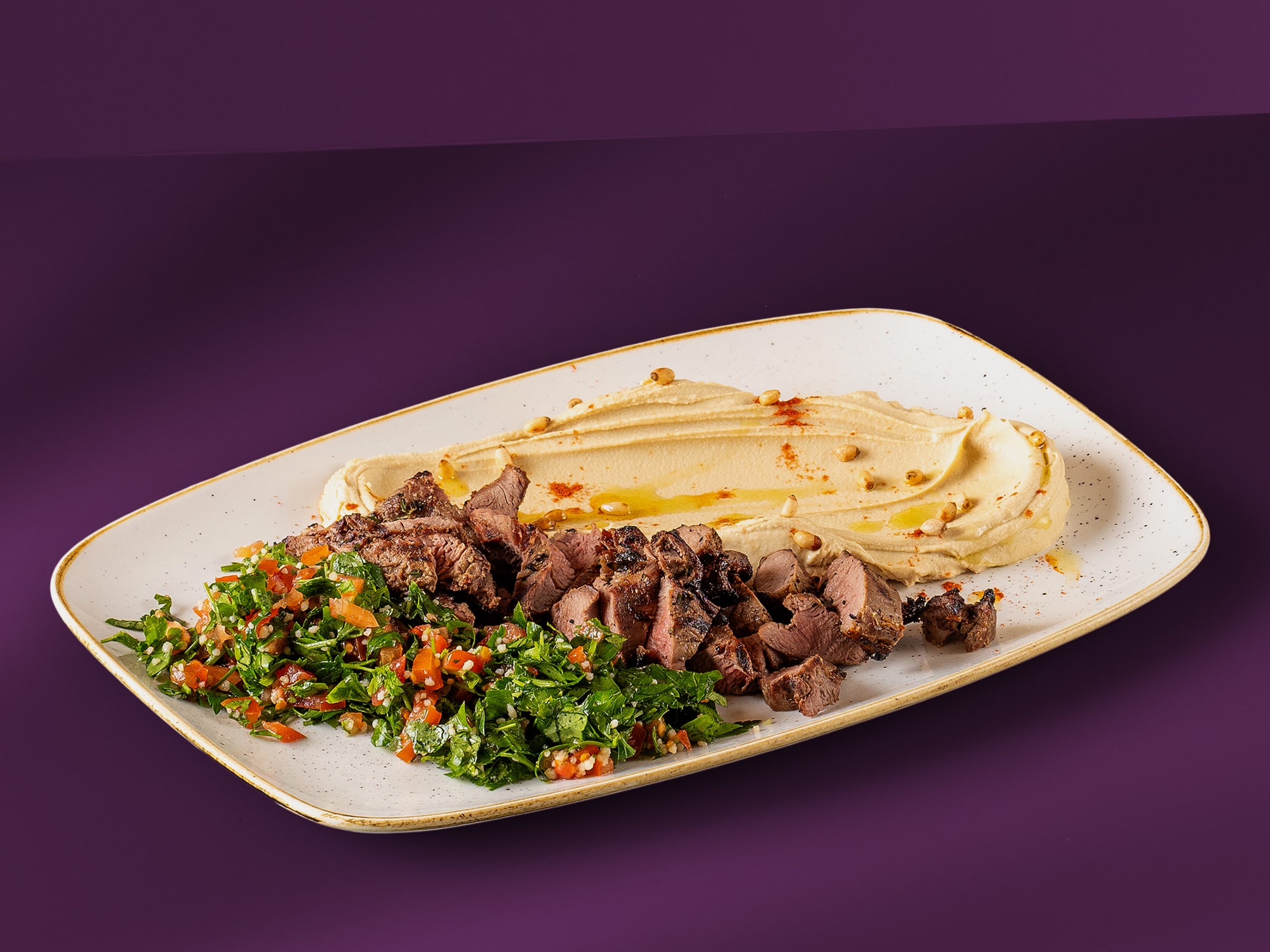 Hummus, salată de pătrunjel cu roșii și cous‑cous,