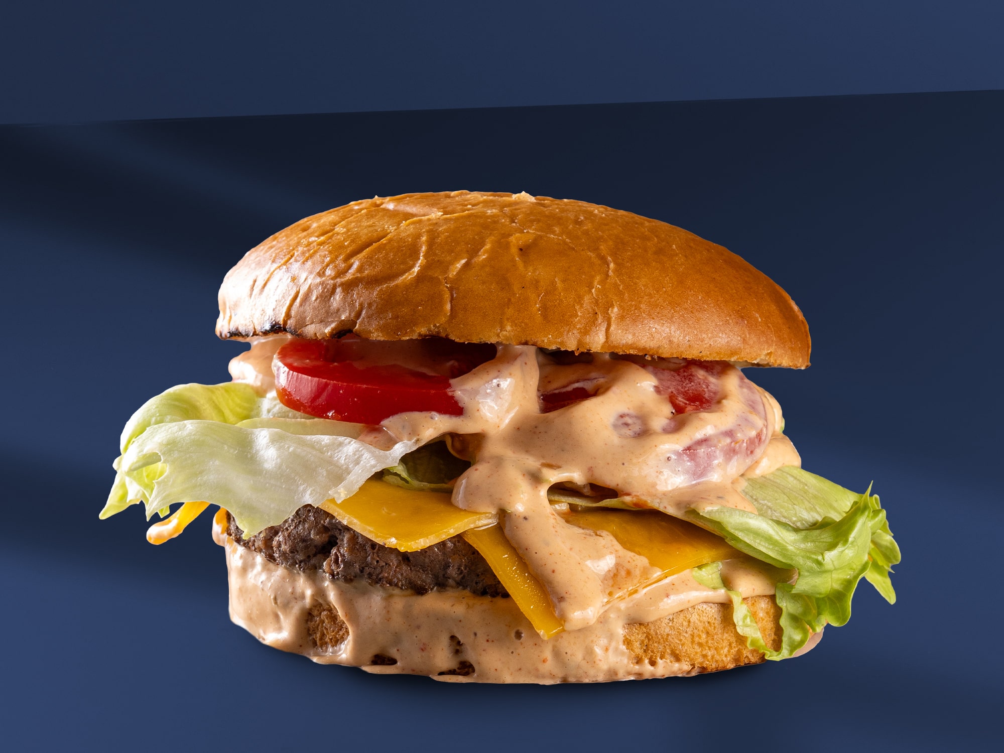 Pastila hamburger -200g, Chifle burgeri -140g, Rosii -40g, Branza Cheddar -30g, Sos shake -20g,